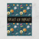 A cute Halloween pattern decorated with eyeballs, pumpkins, spiders, ghosts, ravens, bats, haunted houses, wrapped candy, and black cat images. There is a black stripe, on which is written the words, "Night of Fright" in yellow. Happy Halloween!!