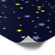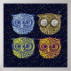 Four graphic owl illustrations in a starry deep blue sky to decor your home walls