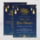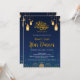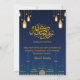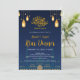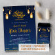 Invite your guests to a beautiful evening of reflection and community with this stunning Iftar invitation. The design features a majestic navy blue mosque silhouette set against a deep night sky, adorned with glowing golden lanterns, stars, and crescent moons. This atmospheric and elegant card is perfect for Ramadan dinner parties, community Iftar events, or Eid Al-Fitr celebrations.