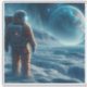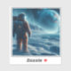 An astronaut stands on a frost-covered surface, gazing at a distant, glowing planet in the night sky. The eerie landscape features jagged ice formations, and the atmosphere is filled with stars, creating a surreal and otherworldly environment.