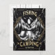 A black and white illustration depicting a tranquil camping scene with a tent, a campfire, and a fishing rod against a backdrop of mountains and a full moon. The text Fishing and Camping Go Together is superimposed over the illustration.