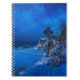 Nighttime winter scene with snow covered pine forest in a moon light at starry night. Panoramic view of coniferous forest with wooden pathway near sea coast against beautiful night sky with stars.