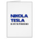 Nikola Tesla is my superhero. Text graphic in black and blue with white lightning.