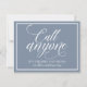 Ces calligraphies esquissées "Call Anyone but the Bride & Groom" carte sont pratiques pour donner à votre mariage et d'autres personnes importantes dans votre mariage. La couleur design est définie en bleu poussiéreux (bleu-gris), mais vous pouvez changer la couleur du design en changeant votre couleur arrière - plan. **COMMENT CHANGER VOTRE COULEUR DE CONCEPTION** 1) Cliquez sur le bouton "Personnaliser". 2) Cliquez sur le lien "ClICK POUR CUSTOMISER PLUS LOIN" en bas. Vous aurez alors la possibilité de changer votre "COULEUR ARRIÈRE - PLAN" en votre couleur mariage. N'oubliez pas de modifier votre couleur de texte pour qu'elle corresponde à votre conception.