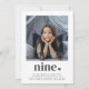 A modern 9th Birthday invitation featuring your own photo and the word 'nine with a heart underneath.