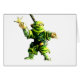 Ninja in camouflage green attacking with shuriken (throwing star) and staff.