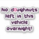 Funny sticker reading No doughnuts left in this vehicle overnight! Complete with a pink iced doughnut.