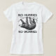 No Hurries No Worries typography with a Sloth illustration design on a branch. Line Art Sloth design in black. Cute and funny animal saying/slogan. Conjunction. Rhyming Catchphrase. This sloth is in no rush, he's never in a hurry.