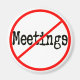 No Meetings sarcastic office humour slogan in distorted letters with a red circle and a line. Don't get trapped in a meeting at work, show them how you really feel with this funny saying.