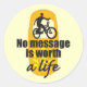 Spread the message with these stylish stickers. The text reads “No message is worth a life”. In the background is a yellow cell phone, and above is a child on a bike. You can change the background colour, if you’d like. This design is available in other colours, or with a dog or a cat instead of the bicyclist. Want this or a similar design on another item? Browse my Dont Text and Drive Store.