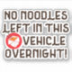 Funny sticker reading No noodles left in this vehicle overnight! There's even a little box of noodles with chopsticks. Ideal for chefs and food delivery staff.