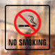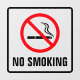 No smoking window cling sign featuring a black cigarette with smoke coming out and a red, crossed over circle around it. Text below: No smoking