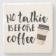 Can't stomach the thought of idle chatter before your morning dose of caffeine? Let this funny coaster do the talking for you. Design features "No Talkie Before Coffee" in black handwritten-style text with a takeaway coffee cup illustration.