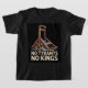 This bold, graphic design features a stark illustration of a wooden guillotine set against a black background. At the base of the structure, two ornate crowns—one large and elaborate, the other smaller—lie discarded and broken amidst scattered rubble and gold coins. Below the imagery, the defiant, distressed-style text reads: "NO TYRANTS NO KINGS."