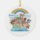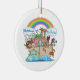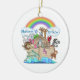 A whimsical ceramic ornament depicting the Noah's ark bible story with cute animals, rainbow and clouds. Personalize for a special baby gift.