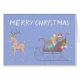 Sur le devant de cette carte de voeux de Noël, un traîneau porte des cadeaux aux enveloppements éclatants et deux petits ours bruns. L'un porte un chapeau de Père Noël, l'autre un pull d'hiver. Le traîneau est tiré par un seul renne tandis que des flocons de neige tombent autour d'eux. Le texte blanc en haut dit "Joyeux Noël". L'intérieur de la carte a l'image d'un ours dans un bas bleu, et plusieurs champs de texte pour vous de customiser.