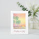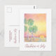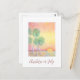 Noël en Juillet invitation carte postale avec typographie script et design de plage tropicale avec palmiers au coucher du soleil. Avec des lettres personnalisables en rouge, vous pouvez ajouter vos propres informations. Une façon festive d'ajouter une touche d'été à votre fête de vacances.