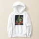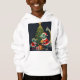 "De mignons dinosaures habillés en Père Noël et des elfes décorent un sapin de Noël. Un T-Rex avec une boîte cadeau dans ses bras minuscules et un brontosaurus enveloppé de lumières de fées. Slogan : "Ayez un Noël Dino-Mite !", Couleurs : vert clair, rouge, jaune, bleu et orange."