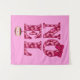 Tapestry in the greeting "Noel" patterned with retro modern Christmas trees in shades of burgundy and pink, embellished with a ribbon bow and a Christmas ornament