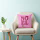 Throw pillow in the greeting "Noel" patterned with retro modern Christmas trees in shades of burgundy and pink, embellished with a ribbon bow and a Christmas ornament