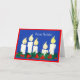 Une carte de Noël italienne lumineuse et de fête avec cinq bougies blanches et houx sur un fond bleu profond, d'un collage de papier peint à la main par Judy Adamson. La salutation sur l'avant, dans le lettrage blanc, est "Buon Natale" et l'intérieur est laissé vide pour votre propre message,