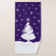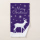 Serviettes de bain de Noël : neiges blanches, ciel de nuit bleu profond avec étoiles brillantes. Lapin regardant le ciel sur le linge; rennes mignons debout sur la neige dérive sur la serviette, et sapin de Noël sur la serviette de bain. Joyeux Noël ! écrit dans une police manuscrite tendance. Ambiance magique de Noël. Chaque article peut être acheté séparément.
