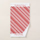 Sucre de canne motif rayé irrégulier avec alternance de rayures épaisses et fines en rouge et blanc. Les serviettes de bain et de la main sont recouvertes de rayures blanches à chaque fin de la journée avec Joyeux Noël en rouge qui peut être personnalisé avec votre propre message.