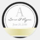 Autocollant mariage rond avec une bordure noire épaisse et un ruban d'or à travers le fond. Texte personnalisable pour un monogramme, prénoms de mariée et de mariée et date mariage. Consultez www.zazzle.com/daisylin712 pour obtenir la correspondance entre les cartes faire-part de mariage et RSVP.