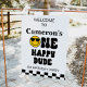 Black White Yellow One Happy Dude Affiche de bienvenue Un heureux mec 1er anniversaire signe de bienvenue pour un bébé garçon avec un visage jaune et des lunettes noires, texte de style rétro et motif en damier noir et blanc.