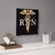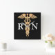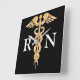 L'horloge a un arrière - plan noir avec un beau symbole goldtone de caducée de couleur au milieu avec le "RN" dans les lettres blanches.