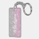 Ombre Pink Silver Parties scintillant Calligraphy Name Keychains présente un arrière - plan de parties scintillant argent et rose faux avec votre nom personnalisé. Un cadeau parfait pour Noël, anniversaire, fête des mères, appréciation des enseignants, meilleurs amis, soeurs et plus encore. Conçu par © Evco Studio www.zazzle.com/store/evcostudio