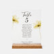 Nom du Mariage floral Numéro du tableau Signes acryliques dégivrés. Ajoutez une touche d'élégance moderne à votre réception de mariage avec ces Mariages floraux sophistiqués Noms d'invités Numéro de table Signes acryliques dégivrés. Chaque enseigne élégamment décorée présente un délicat motif floral et affiche le numéro de table en haut en gras et en caractères élégants, suivi des noms des invités, des noms des couples et de la date du mariage. Parfaitement positionnées sur un élégant support en bloc de bois, ces cartes de séjour minimalistes et design apportent une touche de sophistication et une touche de charme rustique à votre décoration mariage.