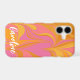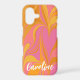 coque iphone avec une motif en marbre abstrait clair et lunatique, avec des tourbillons aux tonalités vives de rose et jaune, personnalisée avec votre nom.