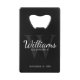 Ajoutez une touche personnelle à votre mariage grâce à l'ouvre-bouteille personnalisé des groomsmen carte de crédit. Ce ouvre-bouteille contient le nom du marionnettiste personnalisé en style de police de script classique blanc avec des détails mariages en style de police serif classique blanc et monogramme en style de police serif classique gris en arrière - plan, sur arrière - plan noir. Parfait aussi pour le meilleur homme, père de la mariée, porteur de bague et plus.