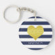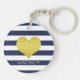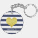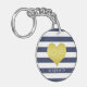 Porte - clé avec un faux coeur de feuille d'or sur un motif rayé bleu et blanc et imprimé de nom personnalisé.