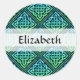 Un ensemble d'autocollants ronds d'un noeud celtique bleu-vert répéta la conception de carreaux de diamant contre un arrière - plan noir. Personnalisez-les avec votre nom !