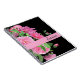 Carnet avec une couleur arrière - plan noire avec une belle impression graphique rose roses et un échantillon de nom. Customisez cet objet et changez le nom en votre nom.