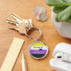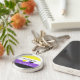 Premium keychain with the non-binary pride flag with little hearts in the centre of the design. Black, purple, white, and yellow flag of the enby pride movement; with an editable text field for your name or message