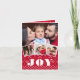 This nordic photo collage Christmas holiday greeting card features a red and white Fair Isle Scandinavian Christmas sweater pattern with the word "JOY" in bold typography and four of your own photos on the front, and your names, year, and sentiment "Merry Christmas!" inside the card. Easy to customize with your own photos, names, and also your greeting.
