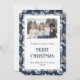 Magical blue photo Merry Christmas card featuring enchanted forest with a fox, folk botanicals and Nordic ornaments. Easily personalize this blue photo holiday card with your photo and family name.