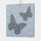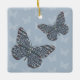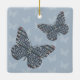 The wings and body of a monarch butterfly are decorated with designs inspired by patterns on sweaters found in the Nordic countries of Norway, Sweden, and Finland, with motifs like snowflakes, mountains, and evergreen trees in white, blue, green, and grey with bright red accents.