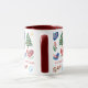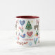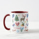 Here is a pretty Christmas theme mug that is covered with scandinavian style images, including a reindeer, pattern hearts, a Holiday tree, flowers, snowflakes, and more. Colours include red, green, gold, blue and brown. Everything is placed on a white background. Unique, colourful, and festive!