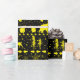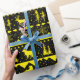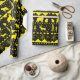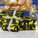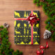 A neutral holiday wrapping paper featuring a black and bright yellow Nordic sweater pattern of winter animals.