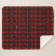 A red and black sherpa fleece blanket featuring a red and black buffalo plaid background with a Nordic sweater pattern of winter animals printed over top of the plaid creating a textured animal themed Buffalo plaid. Makes a perfect holiday pet gift for your furry kids and friends.