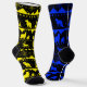 Nordic Sweater pattern of bright yellow on one sock and deep purple blue on the other sock of silhouettes of winter animals on black featuring a polar bear family, the stag deer and the arctic fox.