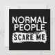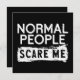 Funny "Normal People Scare Me" design in all white sans serif font with a grunge background. This simple yet eye-catching design makes a nice gift for anyone who doesn't trust "normal" people.