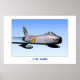 The North American Aviation F-86 Sabre was the first production American fighter to feature swept wings. First flown on October 1, 1947, the F-86 was rushed into combat in Korea after the introduction of the Russian built Migs. The Sabre eventually achieved a 14 to 1 kill ratio over the Mig. A comparison picture of the two rival aircraft can be seen here. The F-86F was an improved version that featured a new wing leading edge, and an all-flying rail. It was powered by a General Electric J47-GE-27 engine, and was armed with six .50 calibre machine guns. 2,640 F-86Fs were built.