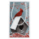 Acrylic Painting of the red Northern Cardinal bird in the winter snow. The snow is gently falling on him, the birdhouse and the frozen holly berries. Original Acrylic Painting Art by Donna Leger. All Rights Reserved. ©irony designs