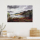 The landscape shows the turning of fall in red and golden hues, with some greens still holding on in the distant hills. The darker evergreens contrast with the lighter hues around them, their colours deepened by the rough elements and the passage of time. Cloud cover gently rushes by in shades of grey and silver, their light reflected on the surface of the water, quietly flowing in the wind. This scenic moment seems to demand a pause for reflection on all that has passed, and all that is still to come.