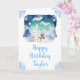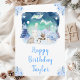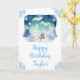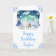 This cute and whimsical birthday card can be personalized with a name or title, such as mom, daughter, granddaughter, niece, friend etc. It features a watercolor winter wonderland scene with adorable arctic animals, such as a polar bear, penguin, cat, owl, seal and a moose. In the background are the northern lights, snow capped mountains and trees. The text combines handwritten script and sans serif fonts for a stylish and modern look. Falling snowflakes and beautiful blue floral arrangements give a winter feel.